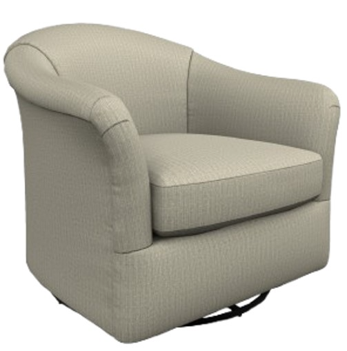 Effortlessly glide in this contemporary barrel chair. Available as a swivel chair or swivel glider, this unit has a reversible seat cushion and a slightly rounded arm with a smooth, pulled-over back. The back is also slightly taller than most barrel chairs.Read More