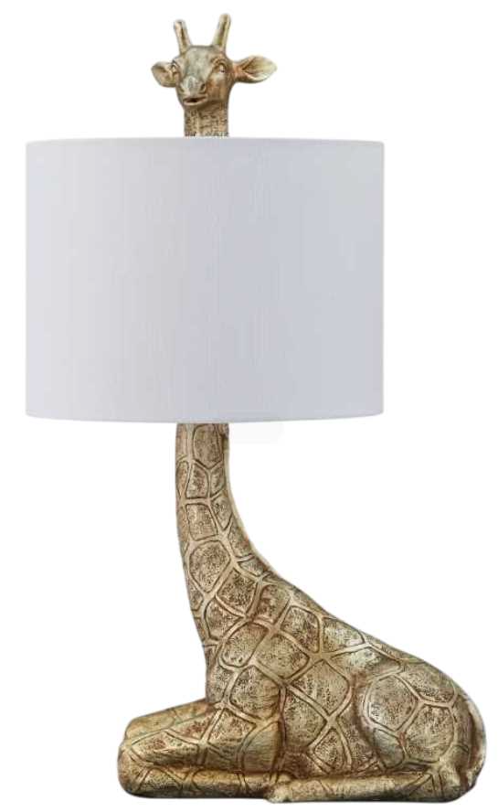 This giraffe lamp combines contemporary style with eclectic charm. The curious animal peeks out over the top of the shade, adding a playful touch to the safari-inspired vibe. For glam appeal, a goldtone finish completes the look.Read More