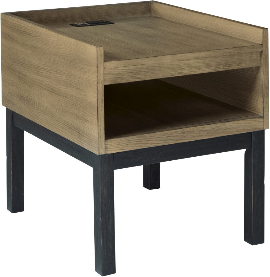 Modern contemporary design meets versatile function with the Fridley cocktail table and end table. This contemporary matching two tone set with White Oak veneers creates a trendy modern look in any space. Cocktail table features a lift-top section, pull-out tray with cup holders, side shelf for easy storage of small items and casters for mobility. Matching end table includes reach in storage shelf and a 110V power supply with dual USB charging ports.