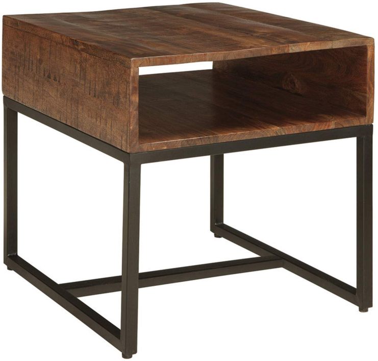 The Hirvanton end table features a natural brown finish over mango wood, a raw steel frame, and an open cubby for storage.