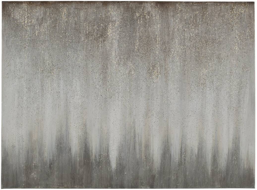 The Paytah wall art features a foggy landscape in a gradient gray and white colors with hints of glitter for an extra spark of light.
