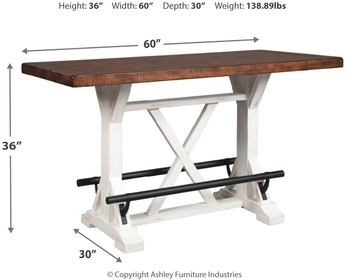 A high-style choice for smaller spaces, this counter height dining table serves up the best in rustic farmhouse living. Its two-tone finish pairs a brown tabletop with a distressed vintage white base for a double helping of charm. Black metal foot rests add such a distinctive twist.Read More