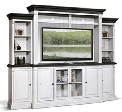 Complete your entertainment room area with the media wall from Carriage House's collection. This wall is shown in European cottage finish and is also crafted from mindi, mahogany solids, and veneers.Read More