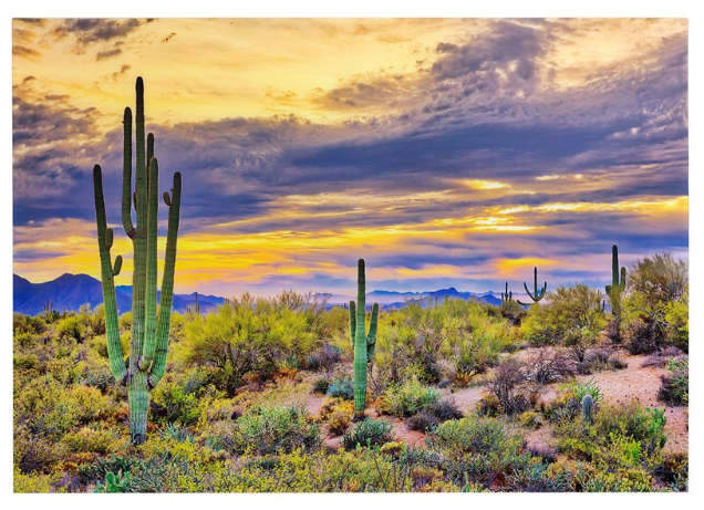 This glass art piece beautifully captures the serene sunset over an Arizona horizon. The towering saguaro cacti stand as silent sentinels against the vibrant backdrop of the desert sky, painted in a palette of warm yellows, oranges, and purples.Read More