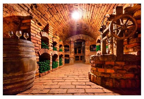 Bring the romance of a winery into your home with this warm, welcoming printed-on tempered glass. A wine cellar is depicted with orange bricks and green accents. This cellar is vast, yet intimate, displaying an element of intrigue. Any wine lover will adore how beautifully this painting complements their home.Read More